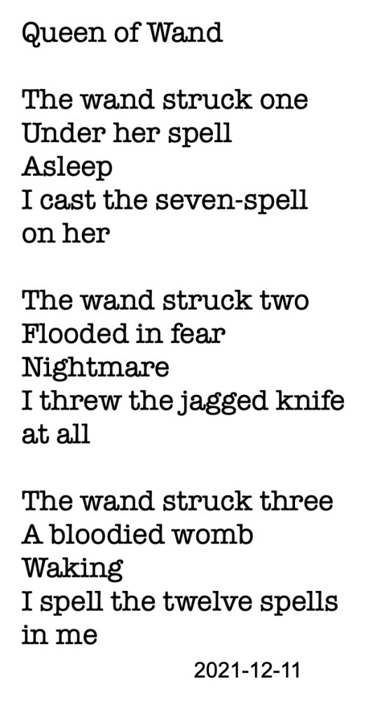 Eva selected a book about Tarot cards. A lady picked the number 72. Eva opened page 72 with the Queen of Wand. And I know nothing about Tarot. I will start learning, after I wrote this.